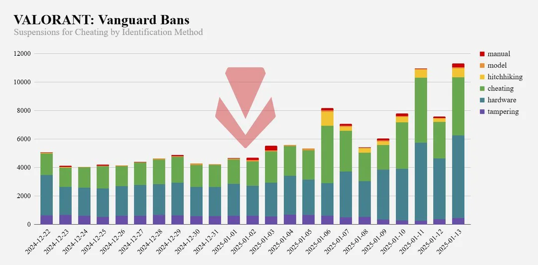 <figure><img src="https://3105513573-files.gitbook.io/~/files/v0/b/gitbook-x-prod.appspot.com/o/spaces%2FkjacOMiVk96mDkbgtNqn%2Fuploads%2F3O4flfYTDgudnqtpd484%2Fhead-anti-cheat-analyst-at-riot-games-shares-ban-numbers-v0-1e9vewrfouce1.webp?alt=media&#x26;token=fab7c87c-e99b-4884-bbbc-6d9031861116" alt=""><figcaption><p><a href="https://x.com/deteccphilippe/status/1878950002632053203">https://x.com/deteccphilippe/status/1878950002632053203</a></p></figcaption></figure>